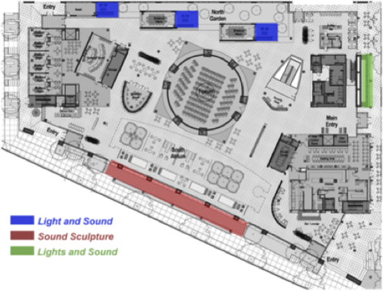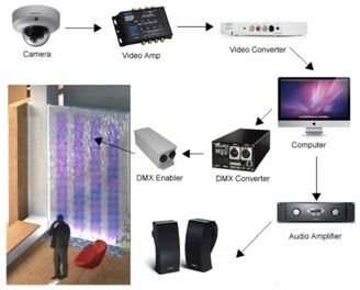 The three indoor water features, located in the interior North Garden area includes interactive light and sound. The diagram to the right shows the basic hardware used to control the interactive lights and sound.