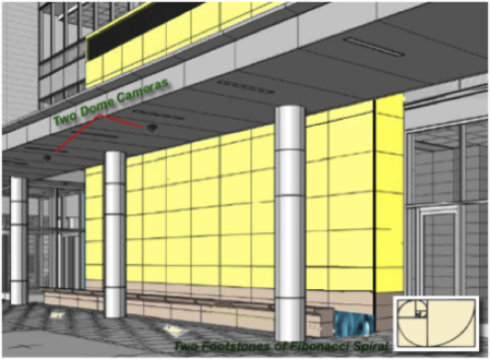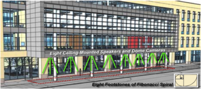 The Fibonacci Spirals foot-stones are etched to designate that particular ratio in the sequence. When the camera located above the foot-stones indicates motion and particular colors, events relative to the sequential ratio occurs.