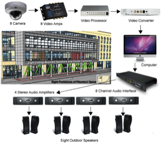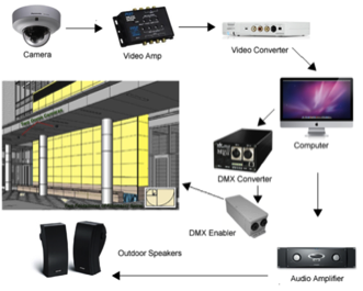 The outdoor interactive sound sculpture is located in the South Porch area are of the WID facility. The diagram to the right shows the basic hardware used to control the interactive sound.
