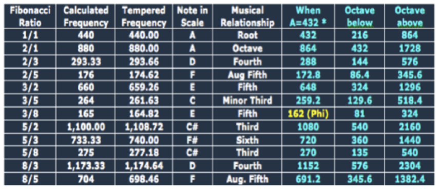 The table above demonstrates the relationship of the Fibonacci Sequence and the mathematical relationship of music notes (frequency of cycles/second), and notes incorporated into musical scales such as five (pentatonic), eight (diatonic), and thirteen notes (chromatic) scales.